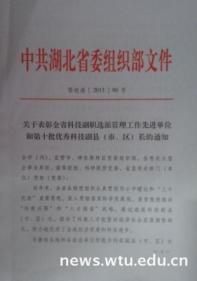 我校环境学院吕斌老师自2011年选派到武穴市挂任科技副市长以来,分管科技工作、协管城乡建设、环境保护工作。他以高度的责任感、优良的作风和强烈的事业心,主动融入地方,全身心投入到武穴改革发展和建设之中,充分发挥自身专业特长,以科技服务提升武穴市政、环保事业建设水平,科技兴农工作效果显著。武穴市连续6年被评为“全国科技先进市”,荣获全省科技新农村建设试点市和省知识产权工作试点市,连年荣获黄冈市科技工作先进市和高新技术产业发展先进县市,其个人也因此荣获 “2011年全国县(市)科技工作进步考核先进个人”称号。